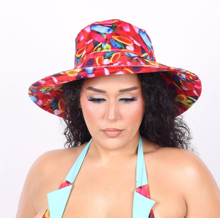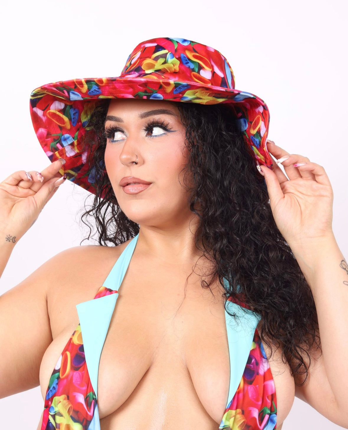 Top off your look with the Doll Parts Wide Brim Hat™— made in the same custom plastic heel print as the swimsuit. Designed to give fashion editorial energy, this lightweight bucket-style hat features a wide, flexible brim that can be styled structured or slouched for drama. Let’s protect that pretty face from the sunlight!